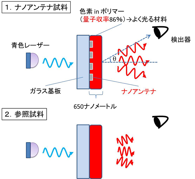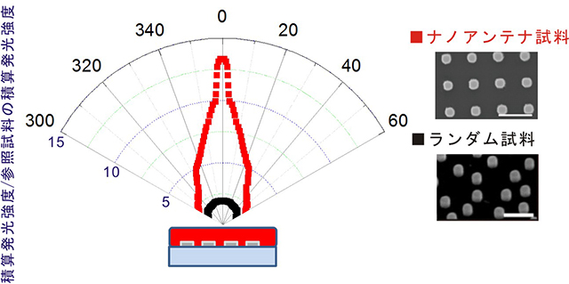 今回、研究グループは、背景で述べられたナノアンテナの問題点を克服し、量子収率の高い発光材料の発光強度を60倍程度まで増強することに成功しました。ナノアンテナとして金や銀ではなく、安価な金属アルミニウム粒子の周期構造を採用し、ナノインプリントリソグラフィーによって大面積(10センチメートル四方)で精度の高い加工に成功しました。実験に使用した構造を図3に示します。ガラス基板上に作製したナノアンテナの上に、発光層として色素(量子収率86%)を含むポリマー膜を塗布することで試料としました。この発光層の厚さを650ナノメートルと、従来の研究に比べ非常に厚くすることで、金属による失活効果の低減を狙いました。この試料を青色レーザーで励起したところ、ナノアンテナがない場合に比べて格段に明るく光り、特に試料面に垂直な方向への発光強度は単一波長での比較で最大60倍にまで増強されました(図4)。また、ナノアンテナ試料では発光の指向性が高まることも明らかになりました(図5)。