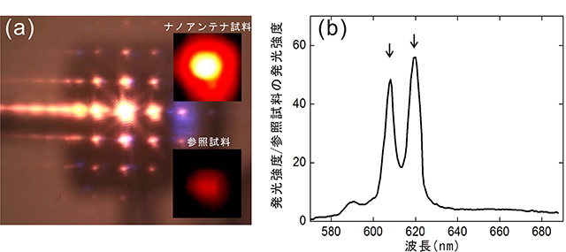 - ポリマー膜からの発光の取り出し効率の上昇:ポリマー膜は屈折率が空気よりも高いために、全反射により色素からの発光の一部が閉じ込められて外に取り出せません。ナノアンテナは光を特定の方向に回折し、外部に放出する役目を果たします。