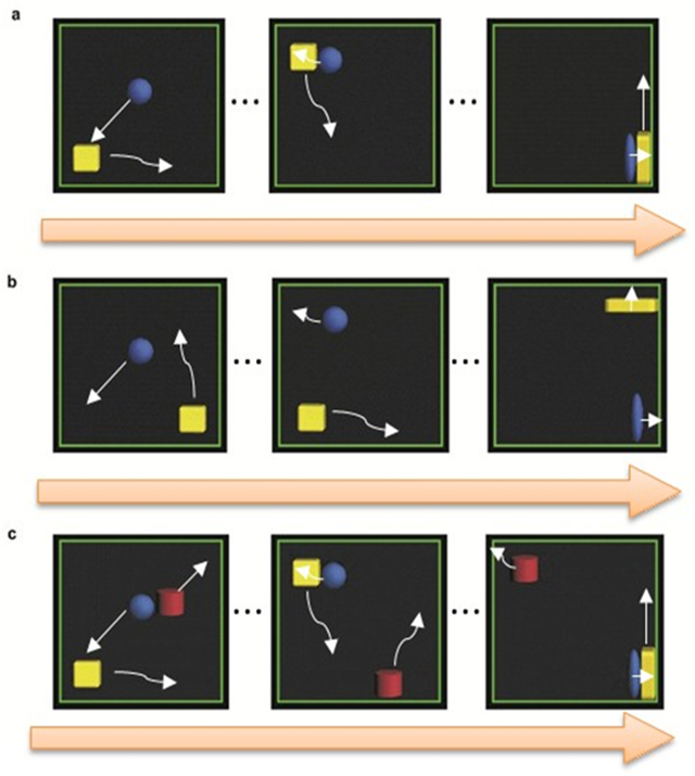 図1:実験で用いた幾何学図形のアニメーションの概要。オレンジの矢印は時間経過、小さな白い矢印は個々の図形の進行方向をあらわしている。(a)攻撃相互作用:青の球体が攻撃者で黄色い立方体が犠牲者(b)接触のない相互作用(c)中立物体(赤い円柱)が加えられた攻撃相互作用