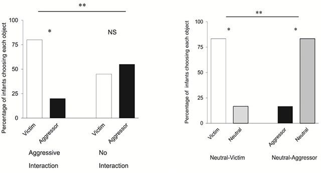 (左)図2:攻撃相互作用条件と接触なし相互作用条件での攻撃・犠牲者への乳児の選択反応。縦軸は各物体を選択した乳児の割合。攻撃相互作用条件においては、犠牲者と攻撃者を対にした際に、犠牲者を選択する乳児が多かったが、接触がない相互作用条件では、そのような偏りはみられなかった。
