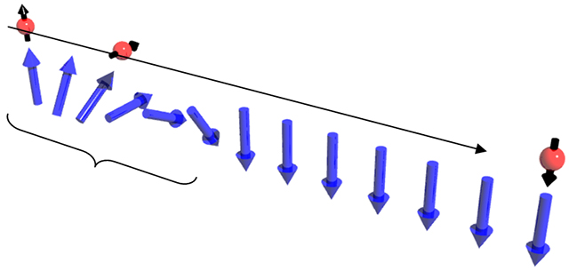 図1:磁壁の概念図。磁壁内部では磁化がねじれた構造をとっている。スピン偏極した伝導電子(スピン偏極電流)を流すと、磁壁内部の磁化はトルクを受け、磁壁全体が電流と逆方向(伝導電子の流れの向き)に移動する。