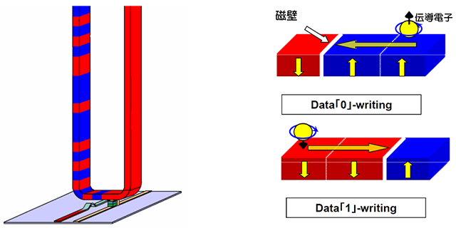 図2:IBM(左)とNEC(右)によって提案された電流による磁壁駆動を用いた不揮発性メモリの概念図。IBMの提案したメモリはレーストラック型メモリと呼ばれ、0と1の情報が書き込まれた磁性細線中の磁壁を電流で駆動して所望のデータを読み出す手法を用いる。NECにより提案されたメモリは中央の磁化方向を電流磁壁駆動によりスイッチさせデータを書き込む。