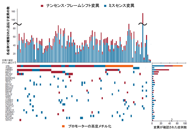 1例あたり平均50個の変異が観察されるが、その多くは、1例でのみ観察される異常であり、意義は不明である。VHL、PBRM1、BAP1、SETD2を除く遺伝子変異の多くは、今回、新規に腎細胞癌で同定された遺伝子変異であり、新規に同定されたTCEB1変異はVHL遺伝子と排他的に観察される。