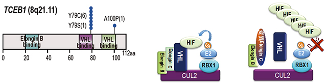VHL分子との結合に重要な特定のアミノ酸に集中して生じる(左)VHLはElongin BやElongin Cと複合体を形成し、ユビキチン化を介したHIFの分解を促す(中央)TCEB1(Elongin C)に変異が生じると、VHLとの複合体が形成されず、HIFが分解されず、蓄積する(右)。