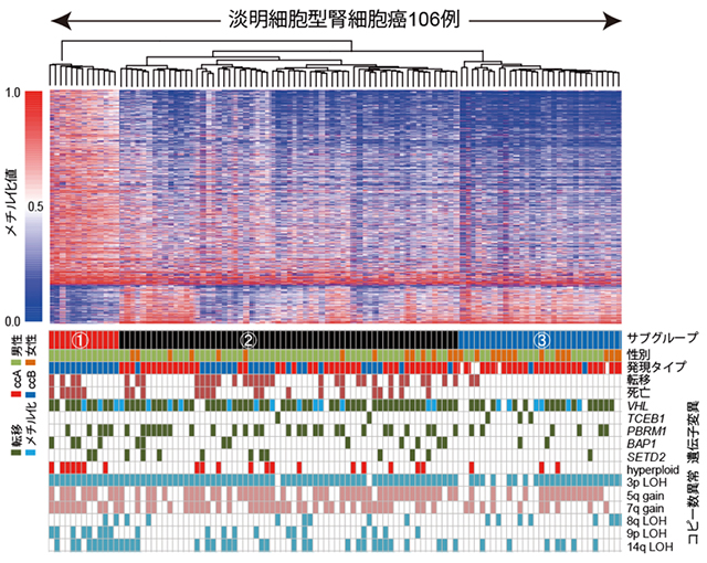 各種の解析を同時に行うことにより、遺伝子変異、コピー数異常、遺伝子発現の変化、DNAのメチル化の状態には、それぞれ密接な関連があることがわかりました。また、これらのゲノム異常のプロファイルから、淡明細胞型腎細胞癌が複数のサブグループに分類できることが明らかになりました。いくつかのゲノム異常は生命予後や再発などの臨床病型と相関をしており、特にメチル状態による分類は予後予測に有用である可能性があります。