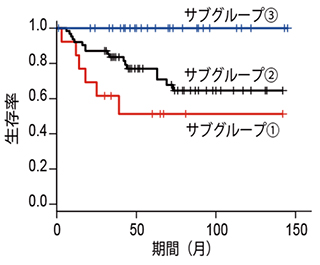 メチル化状態に基づき分類された3グループは、生命予後が大きく異なる。サブグループ(3)では、本解析においては観察期間中、死亡例が観察されておらず予後が極めて良好である。一方サブグループ(1)では、慎重な経過観察ならびに積極的な治療が検討される。
