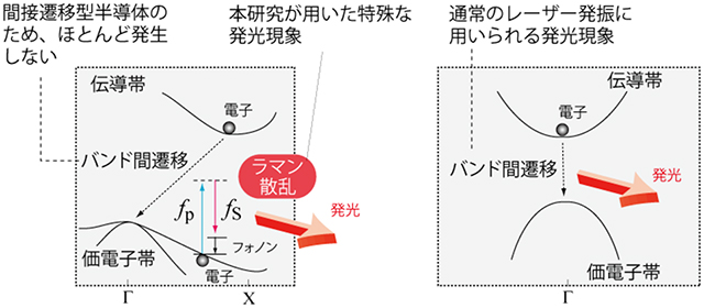 (左)シリコンのバンド構造は、伝導帯の底と価電子帯の頂上での運動量(波数)がずれている間接遷移型である(伝導帯の方が価電子帯よりもエネルギーが高い)。そのため伝導帯に励起された電子がもとの価電子帯にエネルギーを放出して移るとき、光放出では運動量の保存則を満たせないため、そのエネルギーはフォノン(熱)として放出される。したがってシリコンにエネルギーを与えてもLEDのように高効率では発光しない。ラマン散乱は電子を伝導帯に励起せず、価電子帯にいる電子がフォノンを一つ放出する時に発光する現象である。