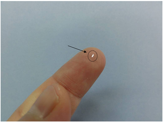 指先の光っている長方形の物体がシリコンチップ。このチップに100個以上のレーザーを集積化できる。