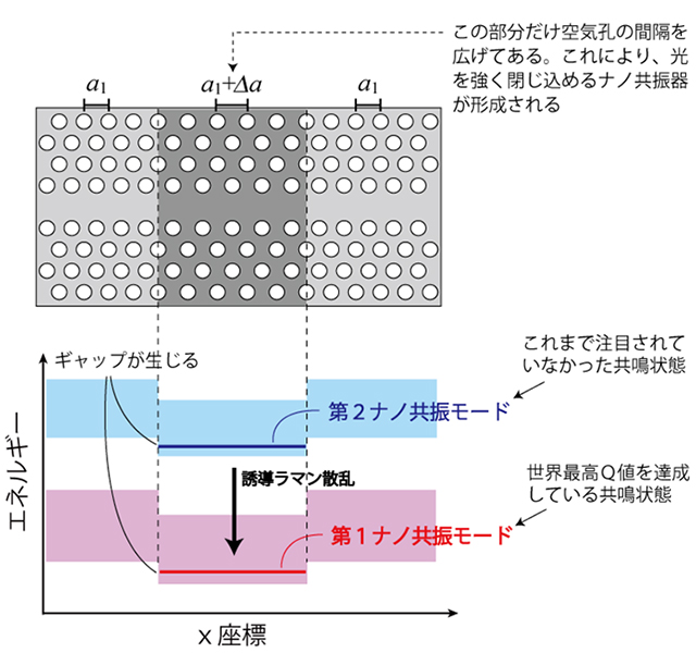 部分的に空気孔の間隔を広げることで、下図に示したエネルギーバンドにギャップが生まれ、光を強く閉じ込める微小空間が作られる。第2ナノ共振モードに光を注入して、ここから発生するラマン光を第1ナノ共振モードに閉じ込める。
