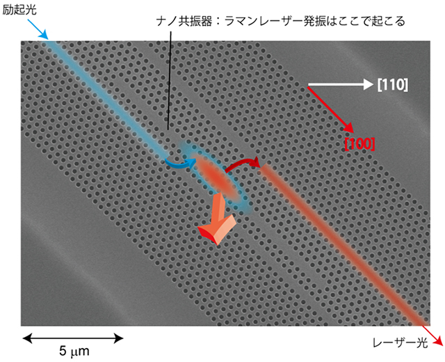 デバイスが通常作られる水平方向([110]方向)から45度傾いた方向に作ってある([100]方向)。左上方から励起光(青色)がナノ共振器に導入され、ナノ共振器内でラマンレーザー発振(赤色)が起こる。今回作製したサンプルでは、測定の都合から、ナノ共振器で発生したラマンレーザー光の大部分は画面垂直方向に取り出されるようにしてある。