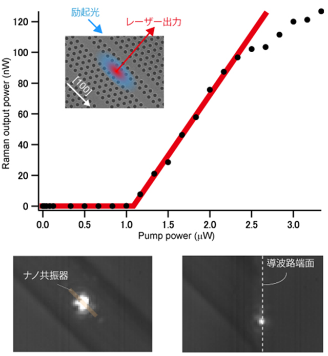 図6:(上)レーザーの入力-出力特性。しきい値1µWで急激に出力が増加して発振している。(下)発振時の光共振器と導波路端面での赤外カメラ写真。図5に示した動作イメージ通り、強い光が放射されているのが分かる。