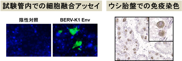 ヒトやマウスの胎盤においては、胎児の栄養膜細胞同士が融合する現象が確認されてきました。その現象には、細胞融合能をもつSyncytinと呼ばれる分子が関わっていることが明らかになっています。Syncytinは内在性レトロウイルスのエンベロープタンパク質(Env)に由来する因子です。内在性レトロウイルスは、祖先の生殖細胞に感染した外来性レトロウイルスが遺伝によって子孫へ伝播し、宿主ゲノムの一部となったものです。本研究グループはこれまでに、ウシ胎盤で特異的に発現するウシ内在性レトロウイルスK1(BERV-K1)のエンベロープ遺伝子(env)を同定しています。