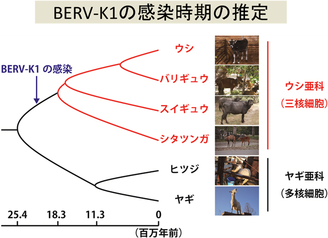 さらに、ウシ科動物におけるBERV-K1の保有状況を調べたところ、ウシやバリギュウ、アジアスイギュウ、シタツンガなどのウシ亜科動物のみがBERV-K1を保有しており、近縁なヒツジやヤギなどのヤギ亜科動物にはBERV-K1が確認されませんでした。(図2)。このことは、BERV-K1がおよそ2000万年前にウシ亜科動物の祖先動物に感染したことを示唆しています。