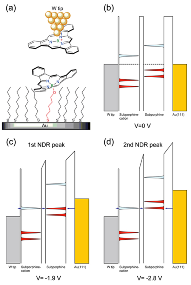 STM探針先端にサブポルフィリンが付着した状態(図2(a)に概略図)で、基板上のサブポルフィリン分子に対して、STSの空間マッピングを2.5×2.5nm2範囲上の8×8(計64点)の格子点で行ったところ、下右図に示すような負性微分抵抗を含む電流-電圧特性を繰り返し観察しました。この現象を解析したところ、図2(b)~(d)に示すようなバンド図となっていることを明らかにしました。