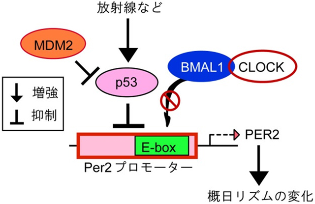 同研究グループは、p53の発現をさまざまな方法(放射線や薬剤、プラスミドの導入)で誘導した場合に、生体リズムの形成に必須の遺伝子であるPeriod2(Per2)の転写を抑制することを発見しました。その分子メカニズムは、Per2の正の転写因子であるBMAL1/CLOCKのPer2プロモーター領域への結合を競合的に阻害することにより抑制するものでした。また、p53欠損マウスの解析から、p53は生体でも同様にPer2の発現を負に制御していることを解明しました。次に、p53欠損マウスの概日リズムを計測すると、野生型とくらべ、一日の時間が有意に短いことが分かりました。これらの結果は、がん抑制遺伝子であるp53は概日リズムの重要な制御因子でもあることを示唆しています(図2)。