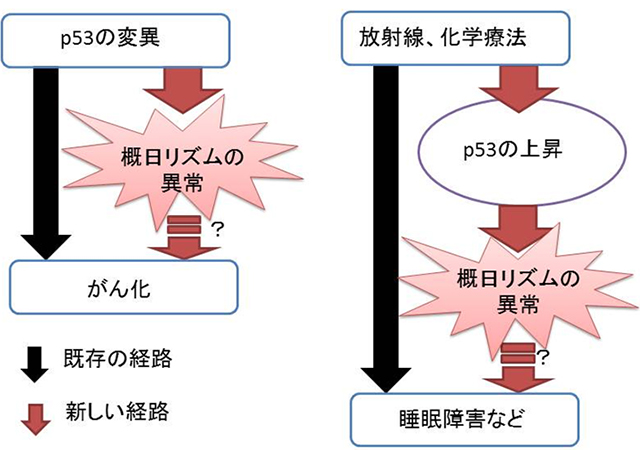 がん抑制遺伝子であるp53を機能欠失した細胞は、がん化が進行すると同時に概日リズムを崩してしまうことから、p53機能欠損によるがん化に、どれほど生体リズムの制御が関係しているかが今後の課題であり、新しい治療標的につながる可能性があると考えています。また、がんの化学療法や、放射線治療により、生体の防御機構としてp53タンパク質がしばしば活性化されます。つまり、これらの治療を行った患者で起こる睡眠障害等を誘導するメカニズムの一因が、p53による概日リズムの変化により説明できる可能性を示しました(図3)。