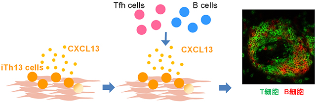 - 炎症サイトカイン(TNFαおよびIL-6)がCXCL13の持続的な産生やCXCL13を産生するT細胞の誘導に関与することから、この細胞を炎症性CXCL13産生T細胞(iTh13細胞)と命名