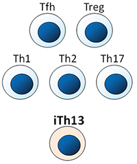 図1:さまざまなヘルパーT細胞。iTh13細胞はこれまで知られているヘルパーT細胞であるTh1、Th2、Th17、TfhおよびTregと異なる性質をもつ新たな細胞集団であった。