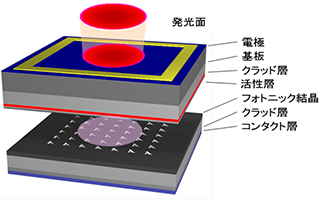 基本構造は、図1に示すように、電子と正孔が結合して光を出し、増幅する活性層近傍に、フォトニック結晶を配置し、活性層に閉じ込められた光がフォトニック結晶の共振、回折効果を受けるように構成します。本開発品は、出力を増大させるためにフォトニック結晶構造を最適化し、フォトニック結晶を形成後、有機金属気相成長法によりエピタキシャル成長することで素子の信頼性を向上させています。