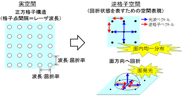 フォトニック結晶の内部では、周期的な屈折率分布の存在により、特定波長の光が特定の方向に対してフォトニック結晶面全体に定在します。本開発品は、フォトニック結晶が正方格子構造を有し、格子点の間隔(周期)が活性層の発光波長の長さと一致するように設定されています。正方格子の辺方向を伝搬する光は、逆方向のマイナス180度方向へ回折されるとともに、マイナス90度および90度方向にも回折を受け、結果として、四つの等価な方向に伝搬する光が互いに結合し合うことにより、特定の波長と方向を持つ光波のみが安定に存在し、2次元共振器が形成されます。これは、フォトニック結晶のバンド端における光の群速度零効果による定在波状態を利用したもので、その結果、2次元大面積共振作用が得られます。