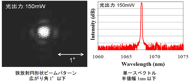上述のように、従来の半導体レーザーでは、発光面積を大きくすると、ビーム品質が劣化し、発振が不安定となりますが、本開発品は、フォトニック結晶により、大きな発光面積においても安定なレーザー発振が可能となるため、単一スペクトル、高ビーム品質動作での大出力化が可能となります。具体的には、本開発品は、ビーム品質を示す、M2と呼ばれる値が、理想的な値1に近い1.1が得られました。従来の半導体レーザーのM2が、面積を大きくした場合、10を超えることを考えると、この1.1という値は、極めて優れた特性を持つことを意味します。
