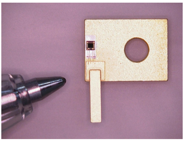 開発したフォトニック結晶レーザー素子を、ベース材料へ組立てた後の写真。素子のサイズはボールペンの先程度のサイズであることが分かる。