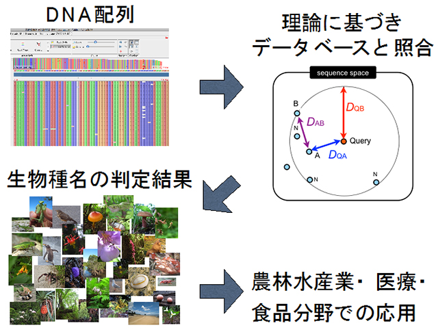田辺元研究員と東樹助教は、このようなDNAバーコーディングを高速かつ自動で行うための、新しい理論的枠組みを構築することに成功しました。この枠組みに基づいたコンピュータ・プログラムはインターネット上で公開されており、生物多様性研究や農林水産業、食品、医療の各分野での応用が期待されます。