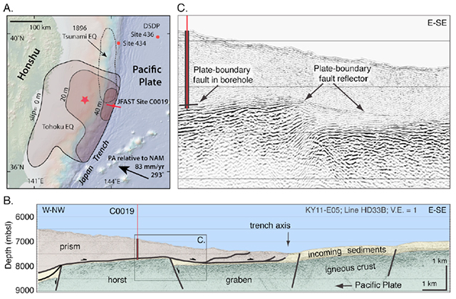 図1:(A)掘削地点(C0019)、震央(赤星印)、そして、断層の滑り量分布を示す。(B) 掘削地点の地質構造断面を示す。掘削地点は、沈み込む太平洋プレートが変形受けた地塁(horst)の上で、遠洋性堆積物(黄色)は薄くなっている。(C) 掘削地点のクローズアップ。プレート境界断層は海溝軸まで続いている。(Chester et al.より)