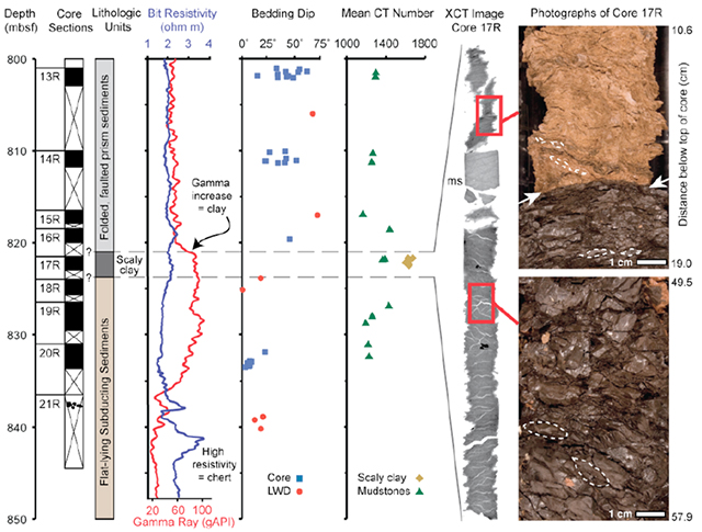 図2:海底下820m付近で地層、地層面の傾斜、物性などの大きな変化があり、プレート境界断層であると確認された。(Chester et al.より)
