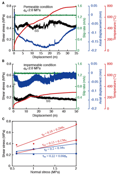 図3:プレート境界断層試料を用いた室内摩擦実験の結果。(A) 透水条件での実験。(B) 不透水条件での実験。(C) 透水条件(赤)、不透水条件(青)ごとでの剪断応力の垂直応力依存性(Ujiie et al.より)