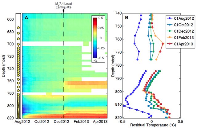 図4:(A) 深度650m以深の計測温度の時系列表示。地温勾配による影響を除き、毎日の観測温度の平均値を示している。(B) 深度方向に、2ヶ月毎の温度分布を示す。(Fulton et al.より)