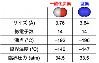 一方、最近になって、金属イオンと有機配位子との複合化によって作られる「多孔性金属錯体(PCPまたはMOF)」と呼ばれる新しい物質が開発されました。PCPは、分子レベルで細孔の大きさや形状、化学的性質を精密に設計することができるため、非常に大きな注目を集めています。COを混合ガスから分離する場合、空気や排ガスに大量に含まれる窒素(以下N2)とCOをどのように区別するかが重要です。しかしながら、COとN2はその性質がとてもよく似ており(表1)、一般的な材料では区別することが大変難しいため、新たなメカニズムに基づく分離材料の開発が必要不可欠です。