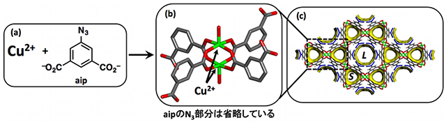 図1:今回開発したPCPの構造。(a)金属イオンと有機配位子(b)銅イオン(Cu2+; 緑色)とaipが形成する基本構造(c)全体の構造と1次元ナノ細孔(LおよびS)