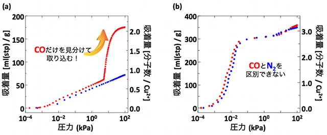 図2:(a)今回開発したPCPと(b)類似構造をもつ従来材料のCO(赤)とN2(青)吸着等温線