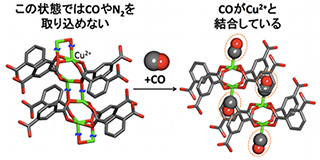 本研究では、ナノ細孔の構造を変化させながら、COを効率よく内部に取り込むことのできるPCPの開発に成功し、COと非常によく似た性質(大きさや沸点)をもち、一般的に分離することが困難であるとされているN2との混合ガスからCOを選択的に分離・回収することに成功しました。