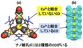 図4:ナノ細孔Sに取り込まれた2種類のCOの様子。(a)細孔を上から見た図(b)細孔を横から見た図