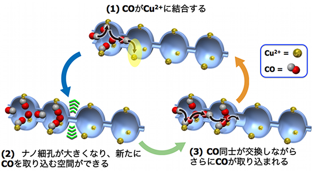 今回の研究では、COを捕捉可能なナノ細孔物質を開発し、混合ガスからCOを効率よく分離し、簡単に回収することに成功しました。またその仕組みを大型放射光施設SPring-8の高輝度放射光を用いて、詳細に検討しました。その結果、今回開発した物質がナノメートルサイズの孔の形・大きさを変えながら、COを効率的に取り込んでいる様子を直接観測することに成功しました。