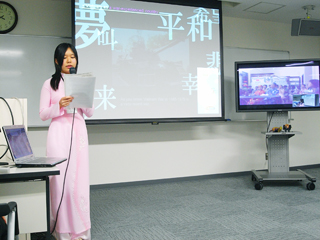 ![]() 受講生による研修報告 | ![]() アオザイ姿の受講生たちと手作りの料理を囲む |