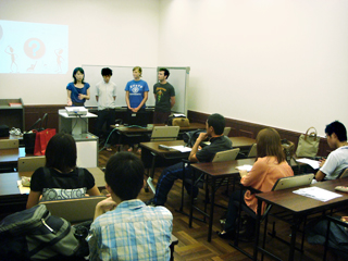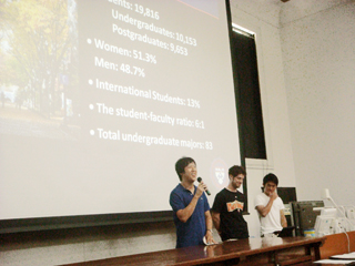 12日のタイ・カセサート大学の紹介に始まり、19日のアメリカ・ペンシルバニア大学、26日のオランダ・ユトレヒト大学へと続き、現在本学で学ぶ各大学間学生交流協定校からの交換留学生の方々から、専攻可能な分野や講義スケジュールのほか、寮・学内施設や食事情に至る広範な情報を提供いただきました。