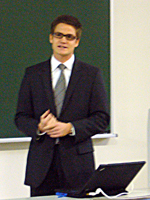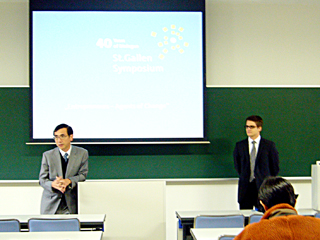 昨年に引き続き、スイス・St. Gallen大学のSebastian Kress氏が来学され、本学大学院生を対象として、St. Gallen Symposiumのプログラム概要、および来年度参加に向けての応募手順・申請書類等に関する講演が行われました。講演後には、これまで実際に参加した学生の専攻分野の別や、日本人学生の全体に対する参加比率等について、英語で活発な質疑応答が行われ、講演者からは参加への熱意と独創性に満ちたアイディアを期待する、という強いメッセージが改めて伝えられました。