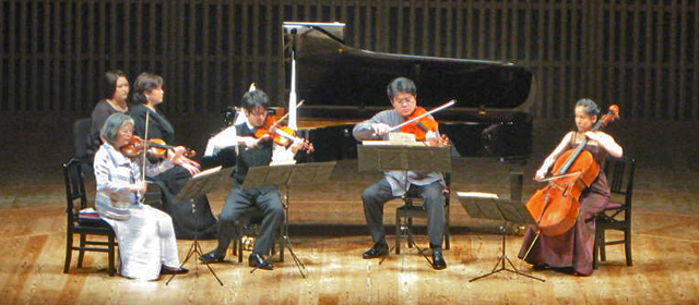 平成22年度京都大学創立記念行事音楽会を開催しました。(2010年6月17日) 6月18日の本学創立記念日を祝し、第54回京都大学創立記念行事音楽会「長岡京室内アンサンブルメンバーによる室内楽」を京都コンサートホールで開催しました。 梅雨の晴れ間の中、長岡京室内アンサンブルメンバーによる迫力のある演奏が、会場を優雅な雰囲気に包みこみました。 演奏の様子