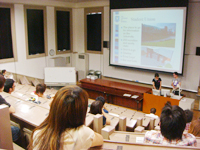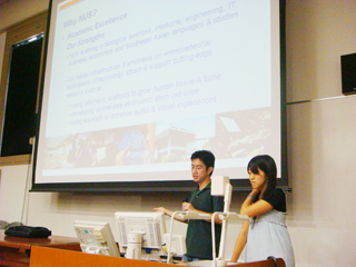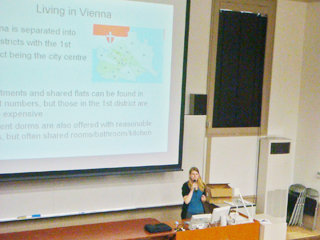 28日のイギリス・シェフィールド大学に引き続き、29日はオーストリア・ウィーン大学、そして30日はシンガポール・シンガポール国立大学の紹介を行いました。本学で学ぶ、各大学間学生交流協定校からの交換留学生と、各協定校での交換留学経験をもつ本学学生が、大学の概要から学部・専攻、宿舎・生活環境や町の様子などの幅広い情報を提供しました。講演終了後には日本語・英語で質疑応答が行われ、参加者は有益な情報を書きとめながら、交換留学の応募に向けての第一歩を踏み出したようでした。
