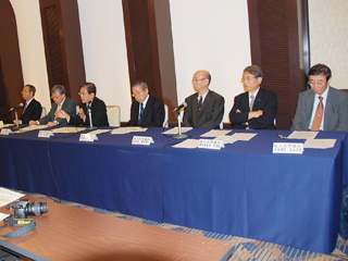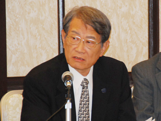 ![]() 発言する松本紘総長 | ![]() 記者会見の様子 |