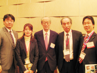 ![]() 京都大学展示ブース | ![]() 尾身理事長(左から3番目) 、犬塚参事官(在米国日本国大使館)(左端)と関係者 |