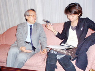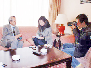 ![]() 中国国際放送局記者のインタビューを受ける大西理事・副学長 | ![]() 北京週報記者のインタビューを受ける大西理事・副学長 |