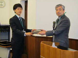 修了式は、双方向教育型共同研究および産官学交流塾に協力いただいている連携企業・機関の方々も列席され、和やかに執り行われました。佐治英郎 薬学研究科長による祝辞の後、長谷部伸治 GL養成ユニット長より第四期生に修了証書が授与されました。第四期生の挨拶においては、「実践英語教育や産官学交流塾での発表を通して、プレゼンテーション力が向上した」、「双方向教育型共同研究や産官学交流塾では、異分野の研究や研究者との交流を持つことができ、視野が広がった」、また「同年代の研究者と交流できたことは今後の研究活動においても有意義であった」などの本プログラム履修に関する感想が聞かれました。