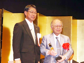 真砂市長からトロフィーを受け取る河野名誉教授(右)