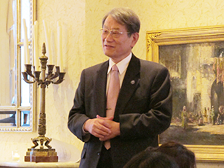 同会は村垣孝 会長(1963年経済学部卒)、久能祐子 副会長(1977年工学部卒)の挨拶で始まり、多彩な出席者の自己紹介の後、松本総長からは、日本語とサンスクリット語の関係についての説が述べられる等、和気藹々とした雰囲気の中、親睦が交わされました。後半には、アメリカ滞在中のギタリストである村治奏一氏によるクラシックギター演奏が行われ、大きな拍手が贈られました。