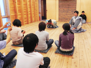 ![]() 「寝音曲」を鑑賞する参加者の様子 | ![]() 笑いと基本姿勢を練習する参加者 |