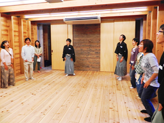 今年の演目は「寝音曲」(ねおんぎょく)、そして 「土車」(つちぐるま)と「七つになる子」という二つの小舞でした。実演を鑑賞した後、参加者全員で基本姿勢や狂言独特の歩き方、笑い方、「寝音曲」の一場面などを練習し、最後に練習の成果をみんなの前で披露しました。質疑応答では、参加者から多くの質問が飛び交いました。